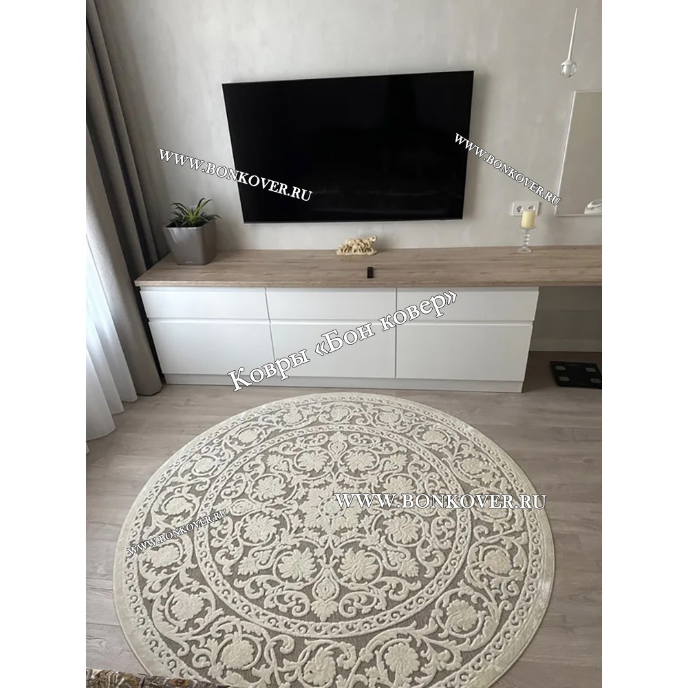 Шикарный Круглый Белый Шелковистый Ковер Дизайн 30542 наполняет интерьер гостиной теплом и уютом, гармонично сочетает в себе изящество и стиль. Он изготовлен из современных материалов, комфортный и долговечный.